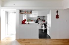 イメージに合っていた白い既存のキッチンは、手直しして再活用。開放感を出すため、出入口にあった大きな収納をなくして、オープンなカウンターと吊り棚を新たに造作。清潔感のある白いタイルの天板と、アイアンの黒が、LDKの雰囲気と良く似合う。カウンター下にはLD側、キッチン側の両方に収納を設けているので、余計なモノはしまえてLDKはすっきりと。これも開放感を出すポイントだ