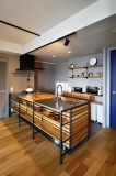 同社から提案され、ひと目で気に入ったというキッチン。無垢材と黒いアイアンフレームで、無駄なくシンプルに構成されたデザインは、Iさん夫婦の住まいのイメージにぴったりと合い、このキッチンを中心にインテリアを創り上げていったそう。また、キッチン前面は吊り戸棚もなくオープンなので、LDはより開放的に。さらに家族やゲストとも会話を愉しみながら料理ができるのもいい
