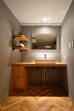 落ち着いた雰囲気の洗面化粧台は、LDKとスタイルを合わせて造作。同じくグレーに塗装された壁・天井に、木のカウンターやヘリンボーン貼りのフロアタイルがよく映える。シンプルだがシックで上品な空間に仕上がっている