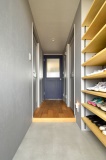 玄関から廊下にかけても、LDKと同じく壁や天井をグレートーンで塗装。統一感があり、スッキリとした印象に。LDKへと続く正面のドアは、同社オリジナルの無垢材のドアをネイビーカラーに塗装し、空間に馴染ませながら、アクセントとして目を愉しませてくれる。玄関収納はオープンにして、靴を出し入れしやすく。閉塞的になりがちな玄関に、ゆとりを持たせる役割もある