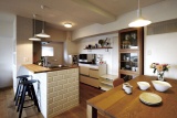 キッチンの位置は変えずに、パリのメトロで使われているという白いタイルで飾った対面式に変更。「以前はキッチンの向かいに洋室があり、そのためどうしても暗くて閉塞感がありましたが、洋室をなくしてリビングを広げ、同時に対面カウンターを利用してカフェスタイルに仕上げました」。