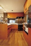 以前は独立型だったため、オープンキッチンに憧れていたHさん。リビングやダイニングで過ごす、家族との会話も楽しめるようになった。ライトコートから入る光で明るさも十分だ。キッチンは土子さんの提案でインテリアと調和のとれたオレンジの面材を選択。空間に楽しさを演出している