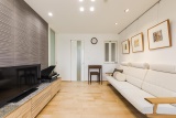 既存の和室とリビング・ダイニングを一体化し、程よくリビングとダイニングをゾーニング。マンションという限られたスペースを広く見せるために、白い壁や明るい木目のフローリングで空間を演出している。壁には、デザイン性に富み、調湿・消臭効果のあるエコカラットをあしらい、アクセントにしている