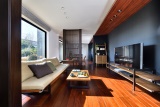 細かく仕切られていた部屋をまとめ、広いLDKを実現。リビングの床には重厚感のあるマホガニーの無垢材を採用。天井の一部にも木をあしらい、温もり溢れる空間を実現している。リビングとDKを緩やかにゾーニングしている縦格子は、構造柱を利用して造作。空間のさり気ないアクセントになっている