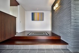玄関を拡張し、壁の一面にアクセントとして千陶彩のタイルを採用。質感溢れる空間となっている。玄関からLDKを通らずに和室に行けるようにしたいという要望があったため、階段の位置を変更することで和室へ直行できる動線を実現。さらに、玄関やLDKを繋ぐ回遊動線にすることで、暮らしやすい空間づくりも行っている