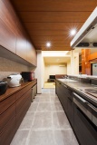 以前、北東側にあったキッチンを新設したLDKに設置。壁付けだったキッチンを対面式に変更することで、家族のコミュニケーションが弾むように配慮した。キッチン背後には食品庫も設けている。畳コーナーと洋室に挟まれたキッチンは、どちらの空間へもスムーズに移動できるのがポイント。床はタイルに見えるが、実際に水に強く掃除もしやすい樹脂製のフロアタイルを採用した