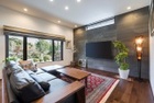「実家に戻ることになったのですが、両親が暮らす隣の建物が母屋のため、私たちが暮らす住まいは、小さく簡易的なキッチンや狭い水まわり、間取りの使いにくさがあり、外観も好みではありませんでした」とNさん。以前の住まいは1LDKのアパートで狭かったため、広いリビングを希望されていました。住友林業のリフォームは、既存のLDKと大壁の和室、廊下を一体化して広々としたLDKを実現。簡易的だったキッチンはフルオープンにして開放的に、背面収納も充実させました。全体的にダークな色調に統一し、木質感溢れるウォルナットの床やキッチン上部を下がり天井にして間接照明を採用することで、上質なテイストを感じさせる空間に仕上げています。