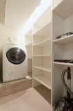 新たに設けた洗濯室。床からの排水の立ち上がりは、洗濯機の下に台を設けることでクリア。かがまずに洗濯物が取り出せるので、むしろ好都合になったとか。タオルなどが置ける棚が造作してあり、掃除機も十分における広さ。キッチンにも近いため、家事室としても活用できる