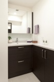 既存の間取りでは、洗面室兼洗濯室は狭い空間に押し込められていた。今回はより広い空間を作るため、洗濯室と洗面室を分離。洗濯機置き場を兼ねた納戸をキッチン隣に配置したことで、洗面室にも大きな洗面台が置けるようになった。夫人こだわりの空間だ