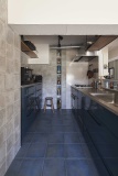 無彩色と木の色をベースに、ブルーをポイントに置いた配色が特徴。「派手な感じではなく、高級感を出したい」というご要望に応え、存在感のあるキッチンをセレクトしました。フォーカルポイントとなる壁にはタイルを使って変化を与え、シンプルなカラーリングが設備と素材を引き立たせるスタイリッシュな仕上がりに。