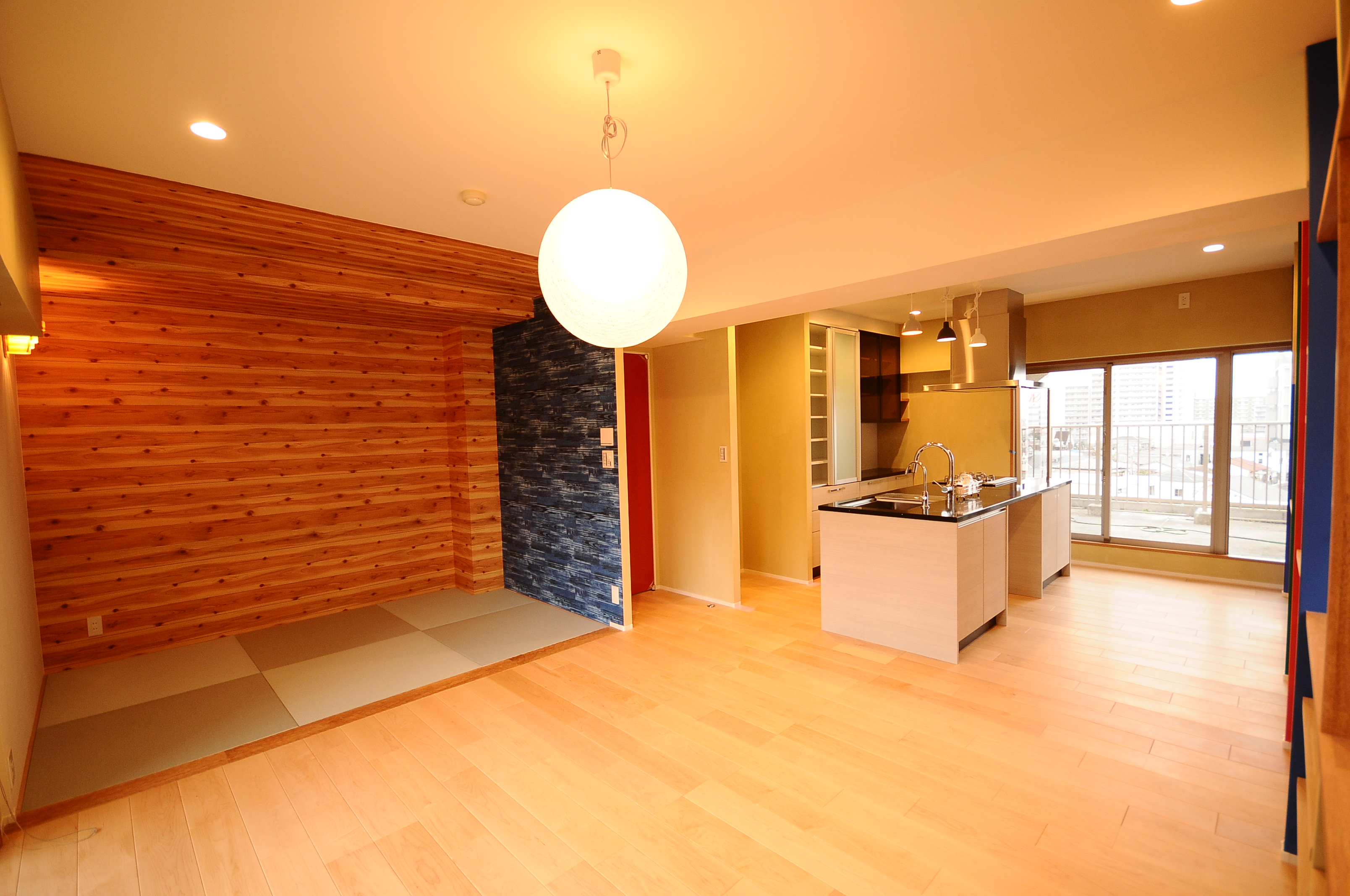 小さなお子様と過ごすための空間として、リビングには畳コーナーを設けました。階段ホールと同じく、壁面はヒノキの羽目板で仕上げています。また、琉球畳を使用することで、モダンな印象に。リビングのフローリングとの境目にはスプーンカット仕上げのオーク材を使用。独特な肌触りが心地よく、小さなお子様が裸足で触れても安心です。