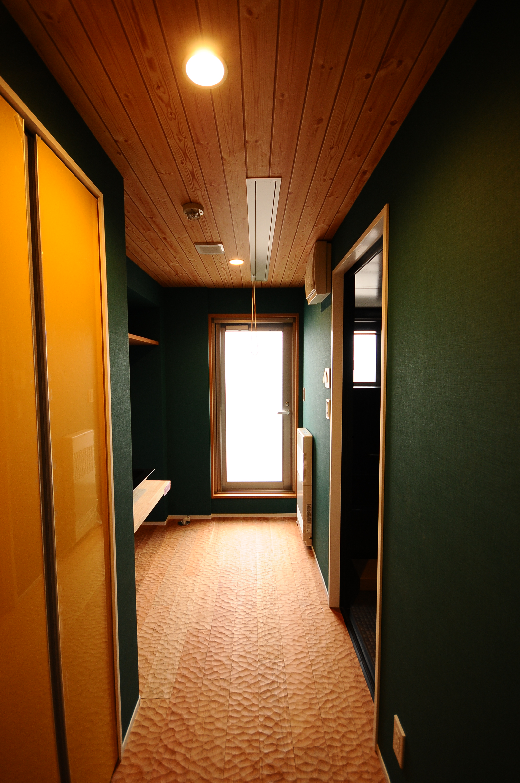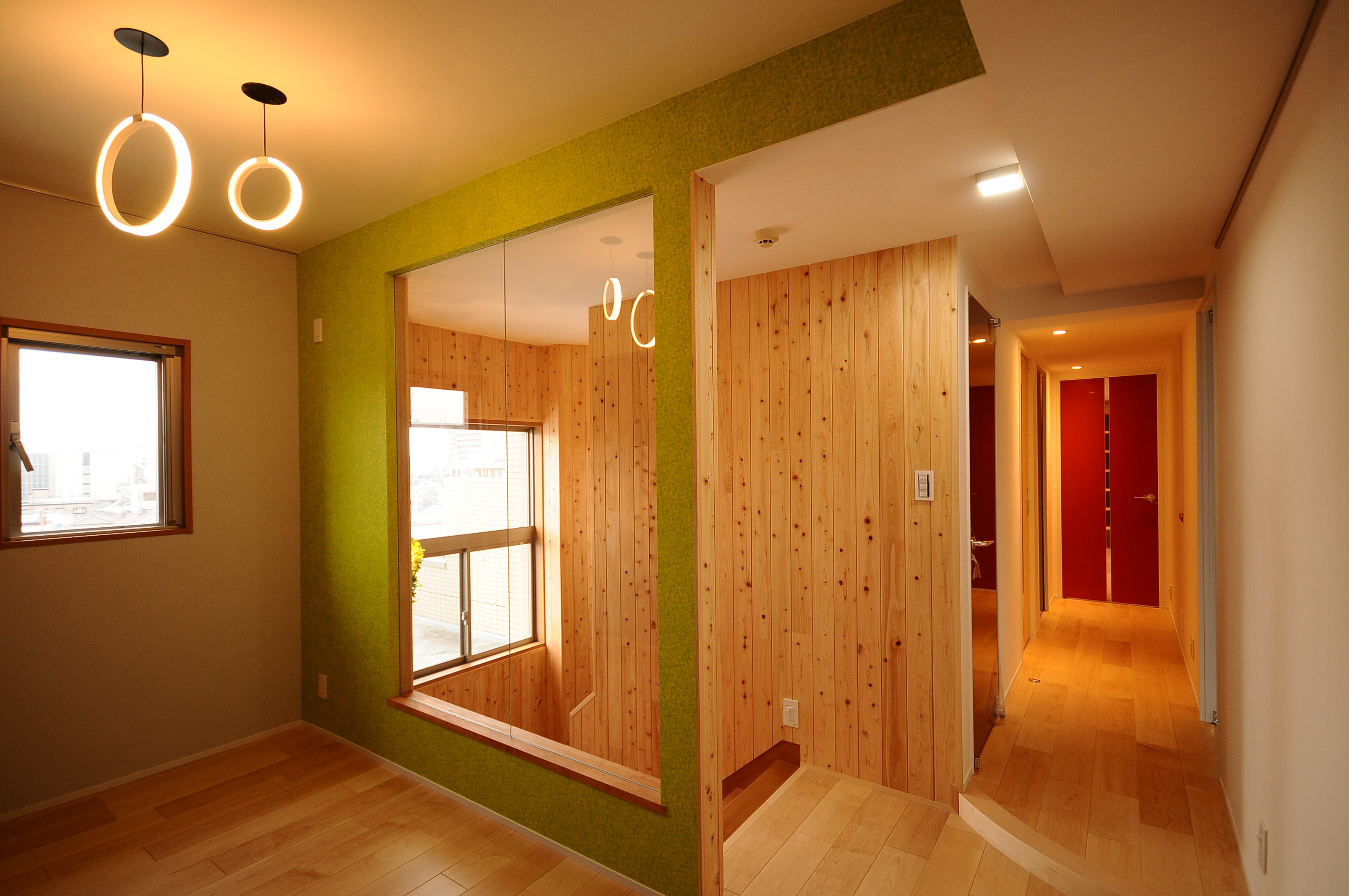 階段ホールの横にあるフリースペースには、趣味のベースギターを飾るため、ガラスをはめ込んだ壁を作りました。視線が抜けるので、階段ホールにも開放的に。グリーンの壁紙とユニークなデザイナーズの照明を採用し、空間に遊び心を持たせています。