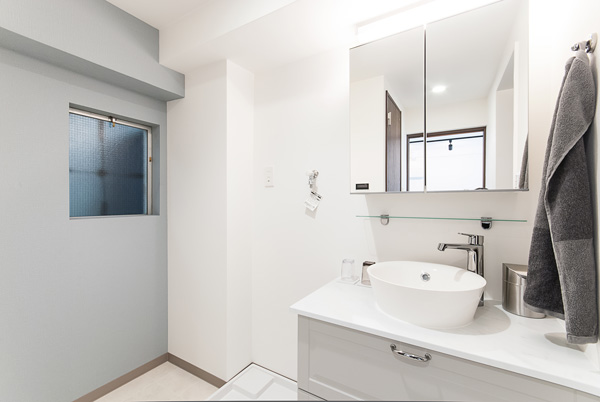 デザイナーズホテルのような趣の洗面室。淡いペールブルーのクロスと大理石調の床材の取り合わせが洗練された雰囲気を演出します。洗面化粧台は空間と調和するよう木製キャビネットと小ぶりの洗面ボウルがお洒落なベッセル型をセレクトしました。