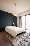 寝室はたっぷりとスペースがあったため、少し小さくしてその分隣のリビングを広々と。床のカーペットと壁のクロスは張り替えてイメージを一新した。壁は一面のみMさん夫妻が選んだ濃いブルーのアクセントクロスを採用