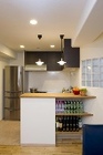 ダイニングに対面していたものの、吊り戸棚もあって閉鎖的だったキッチンを移動してオープンな対面式に。背面収納はオープン棚で使い勝手よく。便利な水廻りへの動線はそのまま活かした。まだまだ使えるキッチンは既存を利用。立ち上がりはモルタル調の左官塗装材で仕上げ、インダストリアルなイメージに
