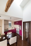 ピンクのシステムキッチンが空間のアイポイントに。調理家電などを置くカウンターの上には室内窓を設置。LDKからの光と風を2階ホールや階段に届ける役割