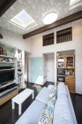 Iさんご夫婦とお母様の生活スタイルの違いからくるストレスをためないために、2階にはコンパクトなキッチンを配したセカンドリビングを計画。増築の提案でスペースを確保し、屋根の形状を変更し天井高を高くした上で、小屋裏収納も創出しています。「トップライトで明るく開放的な空間に大満足です」と笑顔のIさんご夫婦。