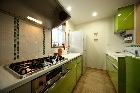 鮮やかなグリーンを用いたキッチンは、シンクとガスコンロをセパレート型にすることでリビング・ダイニングと対面になり、コミュニケーションが図れる間取りに。ガラスタイルが空間のアクセントになっている