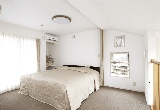 吹抜けに面した2階の寝室。白とブラウンでコーディネートされた落ち着いたインテリアが素敵。ベッドまわりのカーテンで空間が仕切れるようになっており、開放的なオープン空間を満喫しながら、冷暖房効率にも配慮