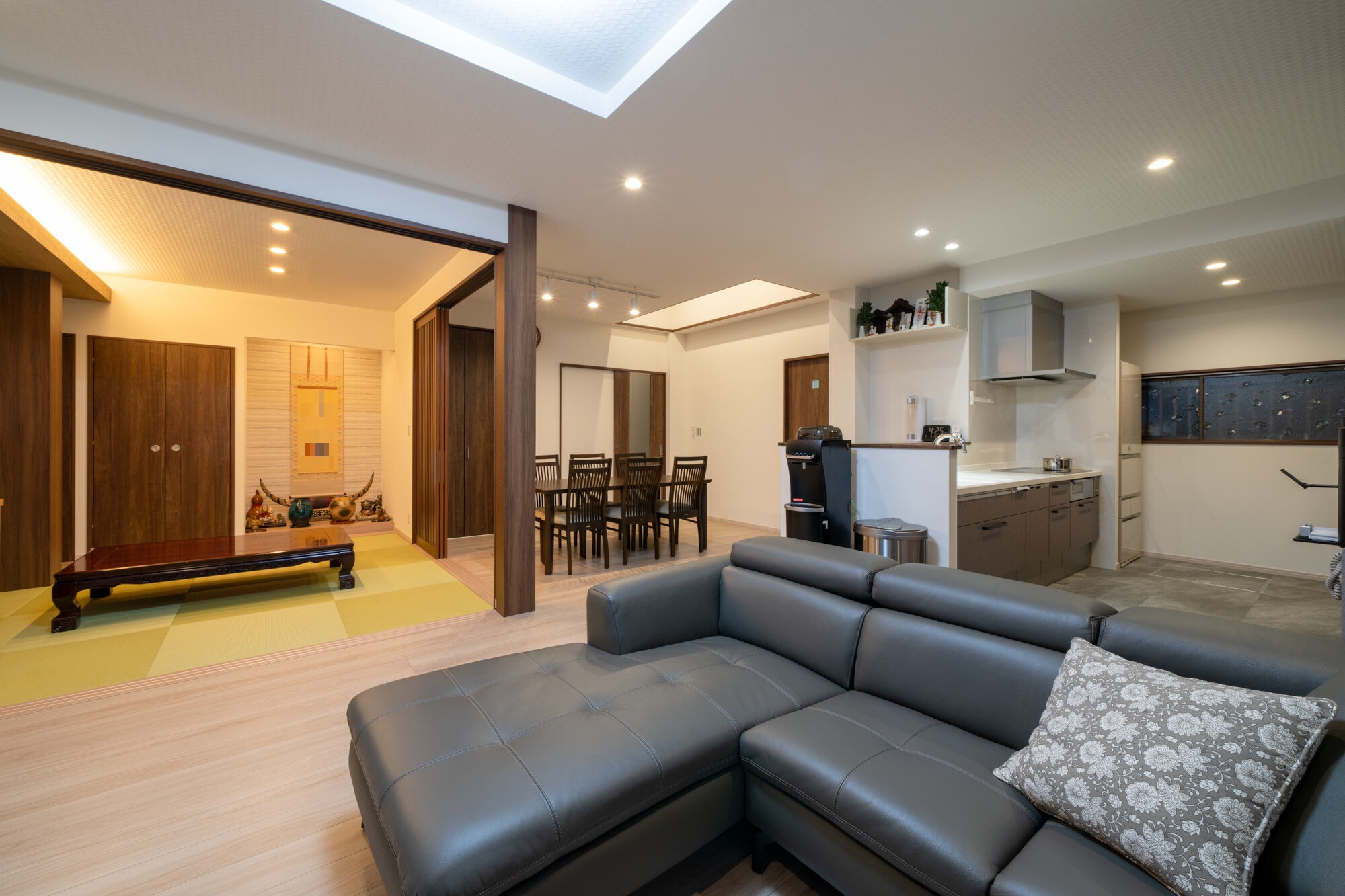 以前は居間とDKが分かれており、使い勝手の悪い動線にお悩みでした。そこで、間仕切りを取り払い、間取りを一体化。さらに、壁際にあった台所を対面式に変更したことで家事動線も改善。「家族と会話をしながら料理できるのが嬉しいですね」と奥様。「IHキッチンは掃除も楽々。スペースも広くなり、動きやすくなりました」