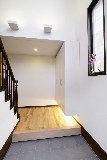照明を工夫することで、より上質感のある空間づくりを行っているのも、特長のひとつ。たとえば吹き抜けの玄関ホールには以前はぶら下がりの照明がついていたが、今回は上に向かってやわらかい光を放つ間接照明を採用している