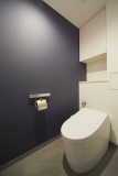 ダークグレーのアクセントクロスとタイル調の床でスタイリッシュに仕上げたトイレ。「ショールームもいくつか行きましたが私たちだけで行かせることはせずに、必ず担当者が同行してくれて、コストや機能面など一つひとつ細かく説明しながらアドバイスしてくれました」とHさん