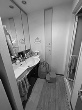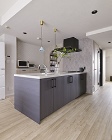 Eさんのお住まいは5年前に中古購入されたマンション。明るさと風通し、生活動線を改善したいとアクアラボにリノベーションを依頼されました。そこで同社では間取りを見直し、家全体を8の字を描くように回遊できる動線を実現。玄関~キッチン、LDK~寝室をつなげ、通路にはウォークスルー収納を備え、収納量も大幅にアップしました。さらに、キッチンの向きを変え、ダイニングと並列に配置できるようにすることで配膳や片づけをスムーズに。内装はグレーを基調に、アーチ壁などを取り入れてオシャレな雰囲気に仕上げています。光と風がいきわたり、家事がしやすくなった動線と洗練されたデザインが融合した、快適なお住まいに生まれ変わりました。