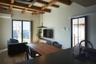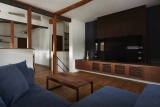2階のリビングルームは、TVボードを空間と調和するようにオリジナルデザインで製作。もともとあった梁は見せるようにデザイン。空間に奥行きをつくりだした