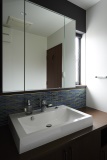 空間と調和し、お掃除などのメンテナンスにも便利になるよう、機能的な洗面化粧台は造作で実現。水がかかる部分にはブルーのタイルを施工するなど、デザインにもこだわった
