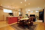 リビング部分を増築することにより、約25畳の広々としたLDKが完成した。ダイニングの上には黄金率で配したダウンライトを用い、豊かな暮らしを照明で演出してくれる。オープンタイプのキッチンは安全・便利なオール電化に