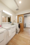以前は玄関ホール側からしか出入りできなかった洗面所は、洋室側にも引き戸を設置。「2方向から出入りができて動きが便利になったうえ、南側からの光が入るようになってとても明るく、風通しもよくなりました。洗面化粧台も広くなり、ゆったりと洗面・脱衣が行えます」とMさん。天井には昇降式の物干しポールも設置した