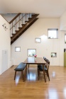 以前は工場だったと思えないほど、家族がゆったりとくつろげるLDKへと様変わり。「家族全員で食事ができる大きなテーブルが置けるようになりました。生活動線もよく、快適です。友人が集まる機会も増えましたね」と大満足。中2階への階段は新設し、既存の階段と上手くつなげている。階段下は大容量の収納スペースとして活用