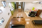 居住スペースが2階のみで、3人の子どもたちの成長に伴い、ますます手狭になると予想していたMさんご家族。使われていない工場を居住スペースとして活かすために、リフォームに踏み切られました。家族全員が集まってもまだまだ余裕のある、大空間のLDKを中心に設計し、水回りなどもすべて1階に新設。アイランドキッチンから、子どもたちをゆったりと見守れる空間に仕上がっています。事務所だった中2階には、トイレとミニキッチンを配して、プライベートな時間を保てるご両親の空間へと一新。また玄関先には妻が営むマタニティ整体院のスペースを確保するなど、暮らしも仕事も充実の理想の住まいへと見事に生まれ変わりました。