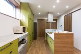 落ち着いた木目調のフローリングや建具を取り入れて、家族全員が和やかにくつろぐのに最適な空間に仕上げています。家事をしながらでも子どもたちを見守れるアイランドキッチンは、木目調にもよく映えるグリーンを採用。シンプルにまとめています。