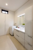 将来、子どもたちが同じ時間帯に洗面室を使う時に、快適に使えるように、洗面室は広さにこだわった。収納にも配慮して、機能性の高い洗面台を採用。換気ができるように、壁面上部には窓も配置している