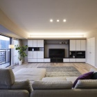 幅280cmのソファを置いても狭さを感じさせない広いLDK。夜景も楽しめるように間接照明を取り入れ、昼も夜も快適に過ごせる寛ぎの空間になりました。水廻りも機能性・デザイン性を重視した商品を選定し、収納もたっぷり確保しています。