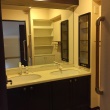 双子のお嬢様がいるため、いずれは洗面台が混雑することを見越して、二人で並んでもゆったり使えるワイドカウンターを採用。五面鏡裏の収納、サイドキャビネットなど、収納もたっぷりと確保している