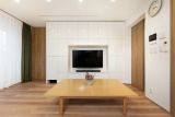 リビングはナチュラルデザインで統一して、明るさを引き立てる空間に。照明もシーリングライトからダウンライトに変えて、すっきりとした印象となった。まるで作り付けのような収納ボードは、既製品を活用。すっきりと収まるようにサイズを確認しながら、壁と扉の位置を調整している