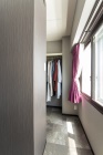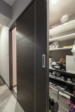 「以前のクロゼットは、前にベッドがあったので日常的に使いづらかった」とHさん。そこで、仕切りで囲むWICに変更。生活していても目立たないように、住居スペースから入口を隠す設計にしています。また、仕切りの天井を開けることで、視線が抜けて圧迫感を感じさせない工夫も。風通しも良く、湿気防止の効果もあります。