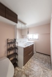 バスルームと洗濯機置き場を移動し、むき出しのダクトパイプを壁に隠すなど、レイアウトを整理して洗面所と浴室の広さを確保。トイレとの仕切りもなくし、ホテルライクな空間に。インテリアは清潔感あふれる、淡いピンクでデザイン
