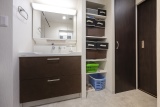 老朽化の目立っていた水まわりを先進の設備へと一新。隣にある洋室との配置を調整し、洗面スペースの拡大とともに、洗面グッズやタオル、洗剤などがスッキリ片付く造作の収納棚を設置。よく使うモノはオープンな棚にして、ストック品は扉付きにするなど、用途に合わせて設計している