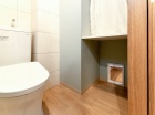 お掃除がラクになるキレイ除菌水が出るウォシュレットを採用。ペットトイレの置き場所をつくり、上部にはペットグッズのストック場所となる棚を造作。消臭効果のあるエコカラットタイルも設置した