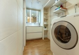 タッチレス水栓を採用。時間帯や天候を問わずに洗濯することができる室内干しスペースも設置。調湿効果に優れたエコカラットタイルは、広さに対してきちんと効果を発揮する面積を計算して設置されている
