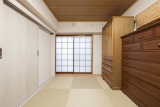 リビングと隣接する和室は、半畳の和紙畳に取り替えるなど、モダンなインテリアにイメージを一新。さらに、新設した3枚引き戸を開けると、ひとつながりの広々とした空間に。引き戸を閉めれば落ち着いて過ごせる個室として、フレキシブルに利用できる