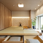 ナチュラルテイストと和の趣が、くつろぎの空間を演出。小上がりの畳コーナーには格子とエコカラットを採用し、間接照明が落ち着いた雰囲気を引き立てます。「旅行先で出会った、居心地のよいホテルや旅館のインテリアをイメージしました」とIさん。お気に入りの観葉植物や、窓に映る桜や銀杏の借景が暮らしに彩りを添えています。