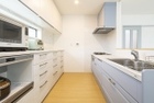 家事動線のいいアイランドキッチンを採用。後方には造り付けのカップボードや壁面収納を設置している。ダイニングテーブルは横並びの配置で配膳・片付けもスムーズにできる