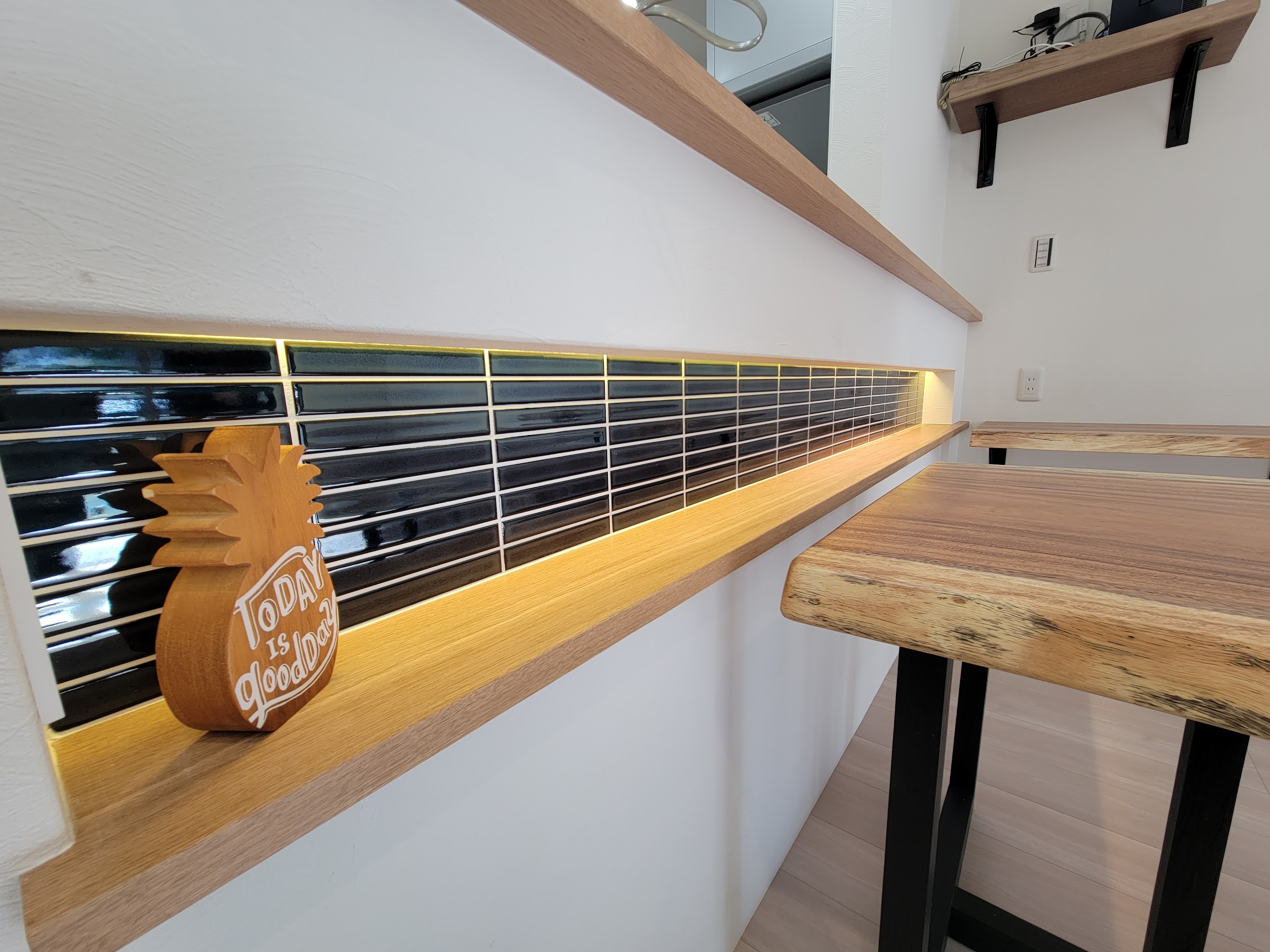 ブルーのグラスを美しく引き立てるため、カウンターニッチにタイルを貼り、洗練された空間を作り出しました。照明がタイルとグラスを照らし、優雅で落ち着いた雰囲気を演出。お酒を注ぐ瞬間が一層特別に感じられる、心地よい空間です。