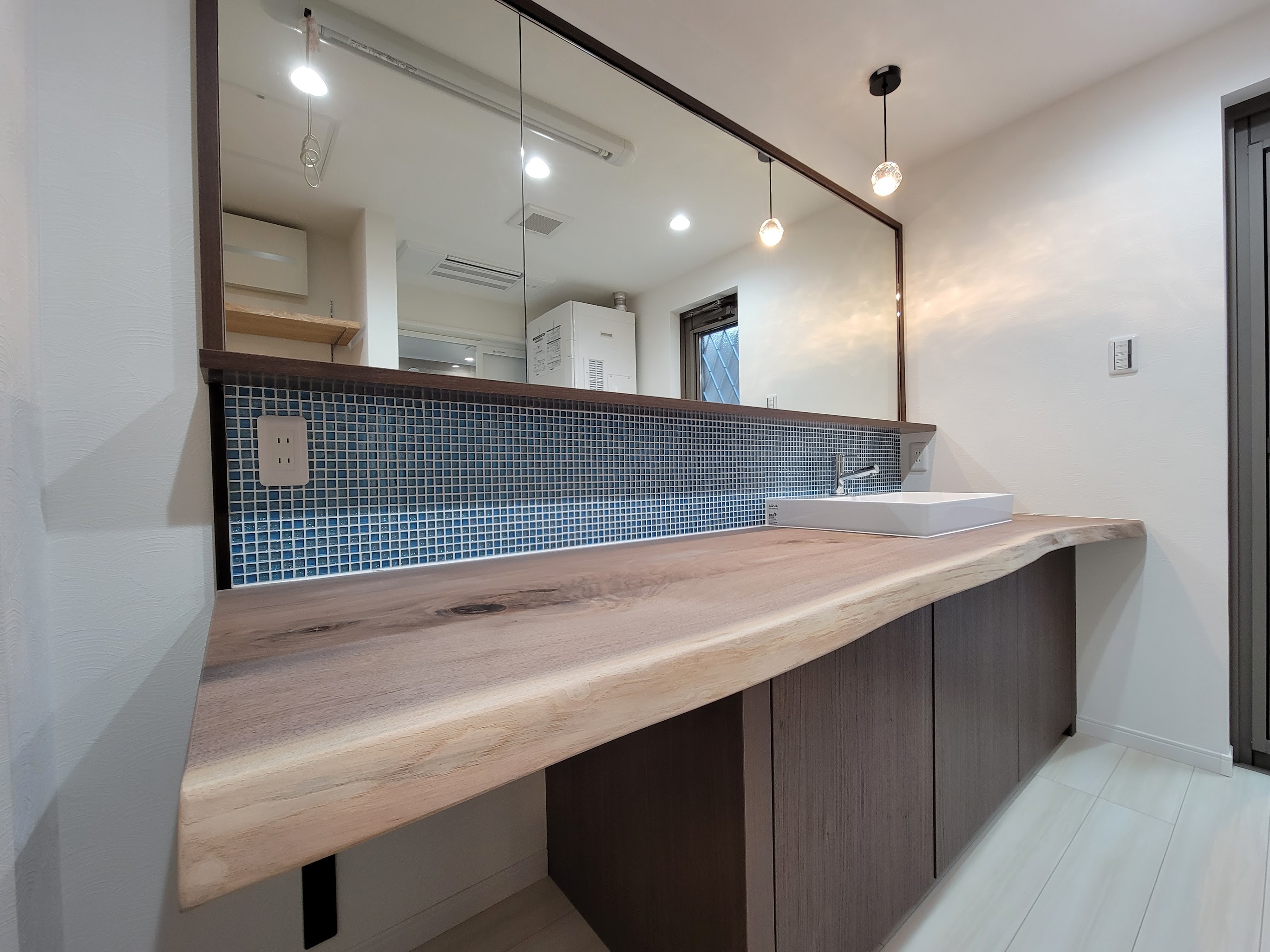 2メーター40センチの無垢の1枚板を贅沢に使用したカウンターは圧巻の存在感を放っています。天然木の温かみが感じられる造作の洗面カウンターは、シンプルながらも高級感あふれる仕上がりに。ミラーとカウンターの間には、モザイクタイルをあしらい、さらなる上質さをプラス。細部にこだわり抜いたデザインが、洗練された空間を演出しています。