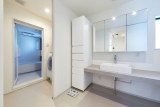 キッチンから続く洗面室は脱衣室、浴室とつながるスムーズな動線。それぞれ仕切れるので家族が入浴中でも気兼ねなく洗面室を使うことができる。またランドリールームも兼ねた洗面室はカウンターや収納棚もあり、家事がしやすいのも魅力