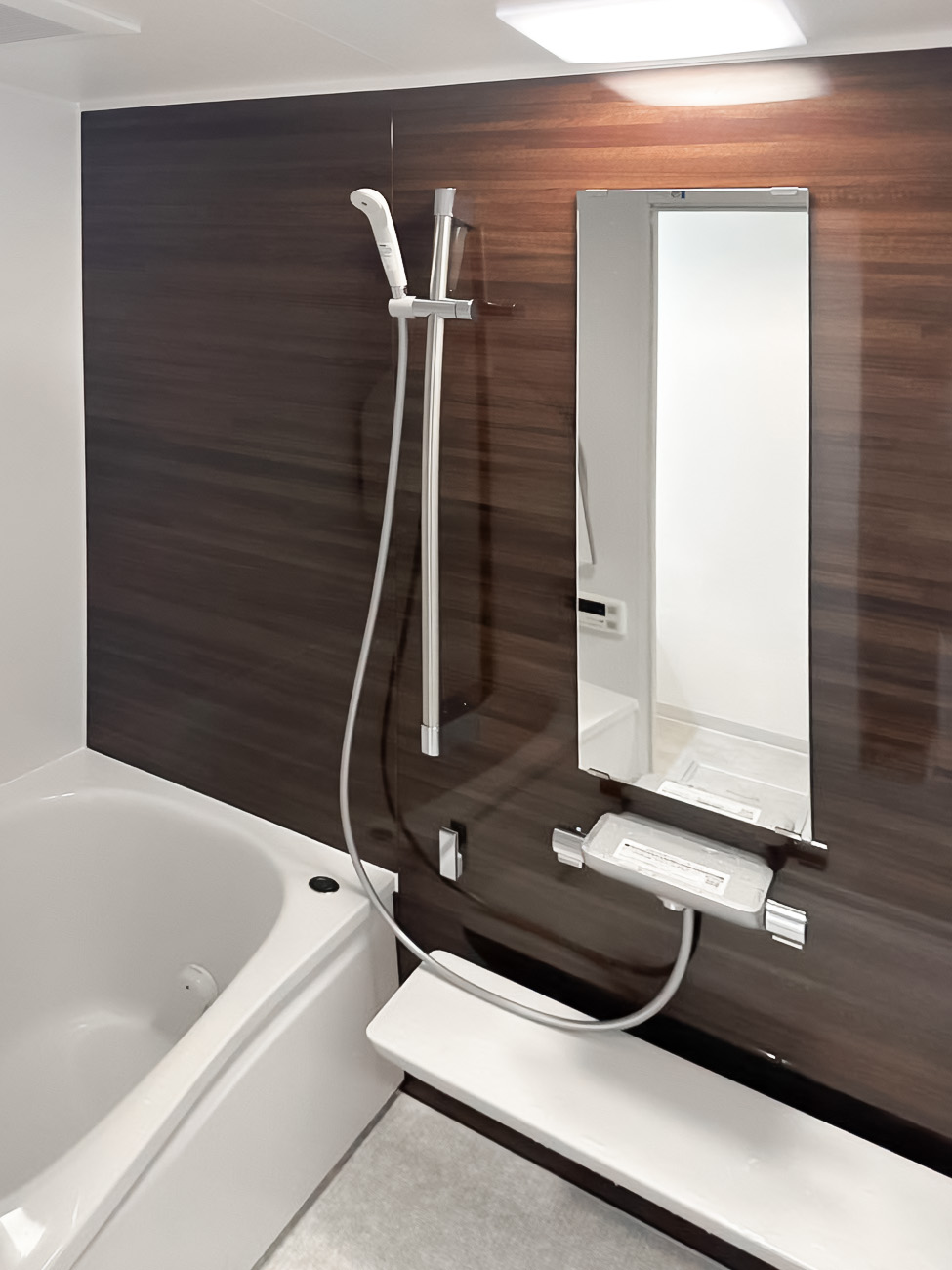 プレキャストコンクリート造の建物であるテラスハウスのサイズが特殊なタイル張りの在来浴室をユニットバス化したい。ユニットバス化する際サイズは極力既存のサイズに近いものにしたい。洗面化粧台も取り替えたいとのご要望を受けて在来浴室のスペースを最大限生かし、ひろびろと脚がのばせるユニットバスに。タイル張りで換気扇もなく寒かった浴室は保温材の入った浴室へ。浴室暖房乾燥機付きで冬場の入浴もあたたかく。洗面化粧台も在来の小さなものからスペースを生かした大きい洗面台に交換。収納も増えて見た目もスッキリしました。